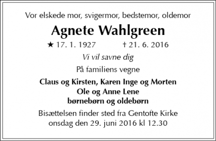 GentofteDette er dødsannoncen for Agnete Wahlgreen. Annoncen blev indrykket i JP d. 27/06/16.