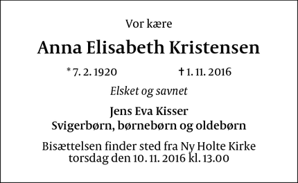Dødsannonce for Anna Elisabeth Kristensen Holte Facebook Twitter Send på mail Dette er dødsannoncen for Anna Elisabeth Kristensen. Annoncen blev indrykket i Berlingske d. 08/11/2016. Dette er dødsannoncen for Anna Elisabeth Kristensen. Annoncen blev indrykket i Politiken d. 08/11/2016. Tænd et lys for Anna Elisabeth Kristensen Dit navn Skriv din hilsen