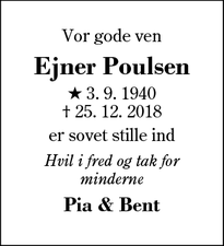 Dødsannonce for Ejner Poulsen Herning Facebook Twitter Send på mail Dette er dødsannoncen for Ejner Poulsen. Annoncen blev indrykket i Herning Folkeblad d. 29/12/2018. Tænd et lys for Ejner Poulsen Dit navn Skriv din hilsen
