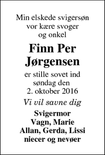 Dødsannonce for Finn Per Jørgensen Horsens Facebook Twitter Send på mail Dette er dødsannoncen for Finn Per Jørgensen. Annoncen blev indrykket i Horsens Folkeblad d. 06/10/2016. Tænd et lys for Finn Per Jørgensen Dit navn Skriv din hilsen