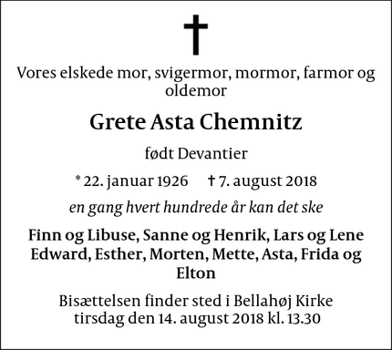 Dødsannonce for Grete Asta Chemnitz København Facebook Twitter Send på mail Dette er dødsannoncen for Grete Asta Chemnitz. Annoncen blev indrykket i Politiken d. 10/08/2018. Dette er dødsannoncen for Grete Asta Chemnitz. Annoncen blev indrykket i Berlingske d. 10/08/2018. Tænd et lys for Grete Asta Chemnitz Dit navn Skriv din hilsen