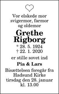 Dødsannonce for Grethe Rigborg Hadsund Facebook Twitter Send på mail Dette er dødsannoncen for Grethe Rigborg. Annoncen blev indrykket i Nordjyske d. 25/01/2020. Tænd et lys for Grethe Rigborg Dit navn Skriv din hilsen