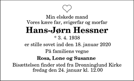 Dødsannonce for Hans-Jørn Hessner Dronninglund Facebook Twitter Send på mail Dette er dødsannoncen for Hans-Jørn Hessner. Annoncen blev indrykket i Nordjyske d. 21/01/2020. Dette er dødsannoncen for Hans-Jørn Hessner. Annoncen blev indrykket i Østvendsyssel Avis d. 21/01/2020. Tænd et lys for Hans-Jørn Hessner Dit navn Skriv din hilsen Grethe Hillerström. Sæby. Ære være Hessner's minde.