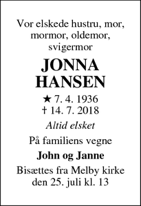 Dødsannonce for JONNA HANSEN Liseleje Facebook Twitter Send på mail Dette er dødsannoncen for JONNA HANSEN. Annoncen blev indrykket i Halsnæs Avis d. 31/07/2018. Tænd et lys for JONNA HANSEN Dit navn Skriv din hilsen