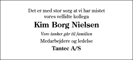 Dødsannonce for Kim Borg Nielsen Esbjerg Facebook Twitter Send på mail Dette er dødsannoncen for Kim Borg Nielsen. Annoncen blev indrykket i JydskeVestkysten d. 10/01/2019. Tænd et lys for Kim Borg Nielsen Dit navn Skriv din hilsen