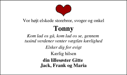 Dødsannonce for Tonny Odense SØ Facebook Twitter Send på mail Dette er dødsannoncen for Tonny. Annoncen blev indrykket i Fyens Stiftstidende d. 29/04/2020. Tænd et lys for Tonny Dit navn Skriv din hilsen